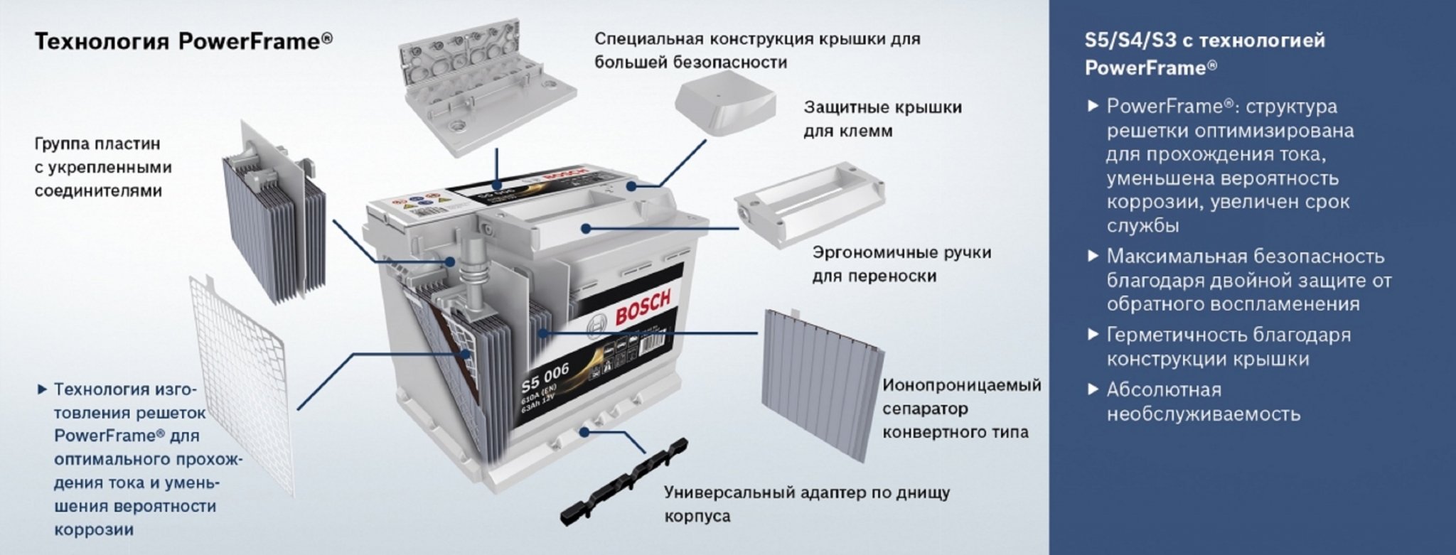 Totes les bateries de la sèrie Bosch S5 no tenen cap manteniment complet, de manera que ja no heu de controlar constantment el nivell d’electròlits, obrir les cobertes i recórrer amb aigua destil·lada.