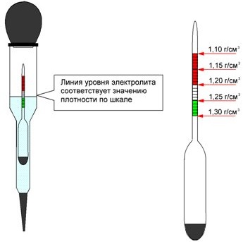 La concentració d’electròlits es determina pel seu nivell a l’escala graduada del flotador. Aquest mètode senzill s’utilitza per mesurar a cada banc de la bateria.