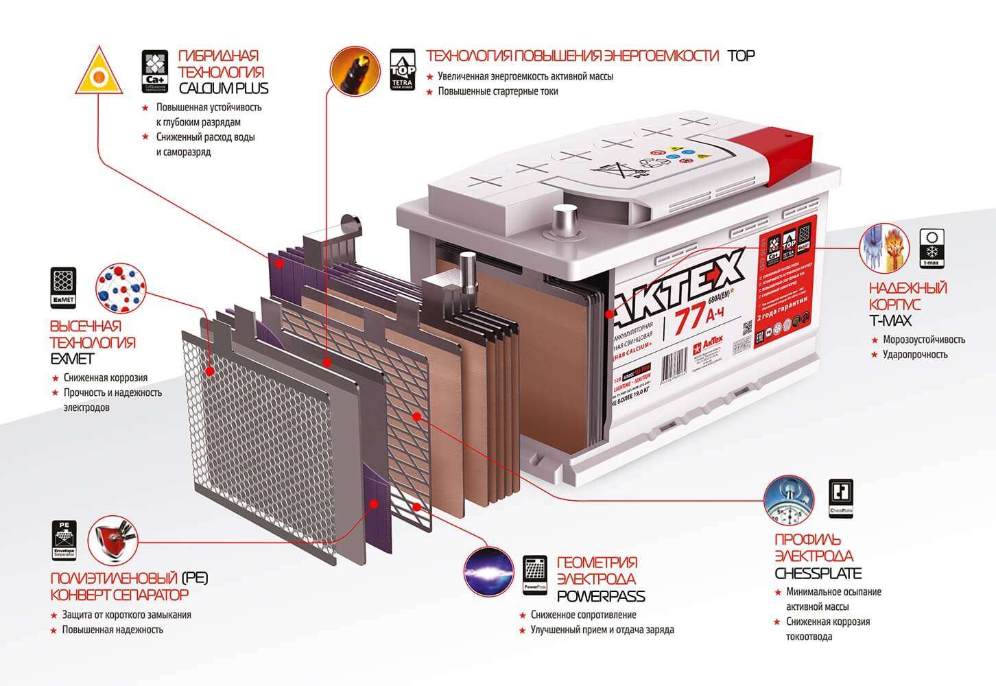 Tělo. Moderní baterie je vyrobena z vysoce nárazového polypropylenu. Tento materiál dobře snáší nejen zvýšené mechanické namáhání a vibrace, ale je také odolný vůči kyselinám, které vyplňují vnitřní dutinu baterie ve formě roztoku. Kromě toho je polypropylen odolný vůči velkým teplotním rozdílům. Pouzdro na baterii je rozděleno do 6 hermeticky oddělených sekcí, do nichž se při výrobě baterie instalují olověné elektrody a separátory.