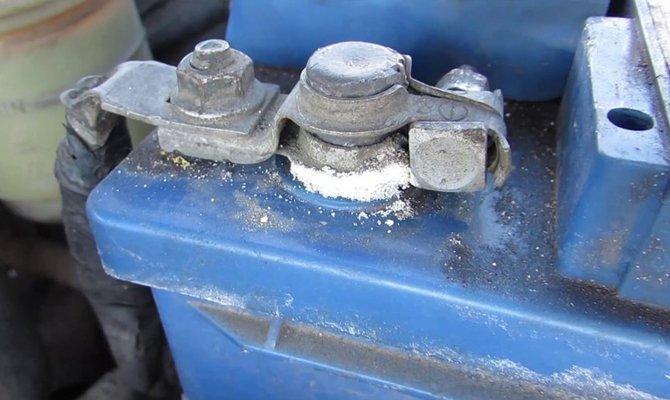 La oxidación de los contactos de la batería se puede determinar tanto por inspección visual como por signos indirectos asociados con una disminución en la corriente de arranque en el arrancador del automóvil y una disminución en el brillo de los dispositivos de luz.