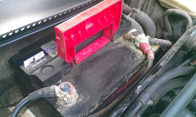 El terminal positivo de la mayoría de los automóviles está cerrado con una cubierta de plástico, lo que contribuye a la acumulación de condensado debajo de él. Si la batería está mal sellada de la exposición a altas temperaturas durante el funcionamiento del motor, así como cuando está muy recargada, el vapor del electrolito se escapará. Las partículas de ácido de estos vapores eventualmente se concentran debajo de la tapa aislante en el área del terminal positivo y conducen a su oxidación.