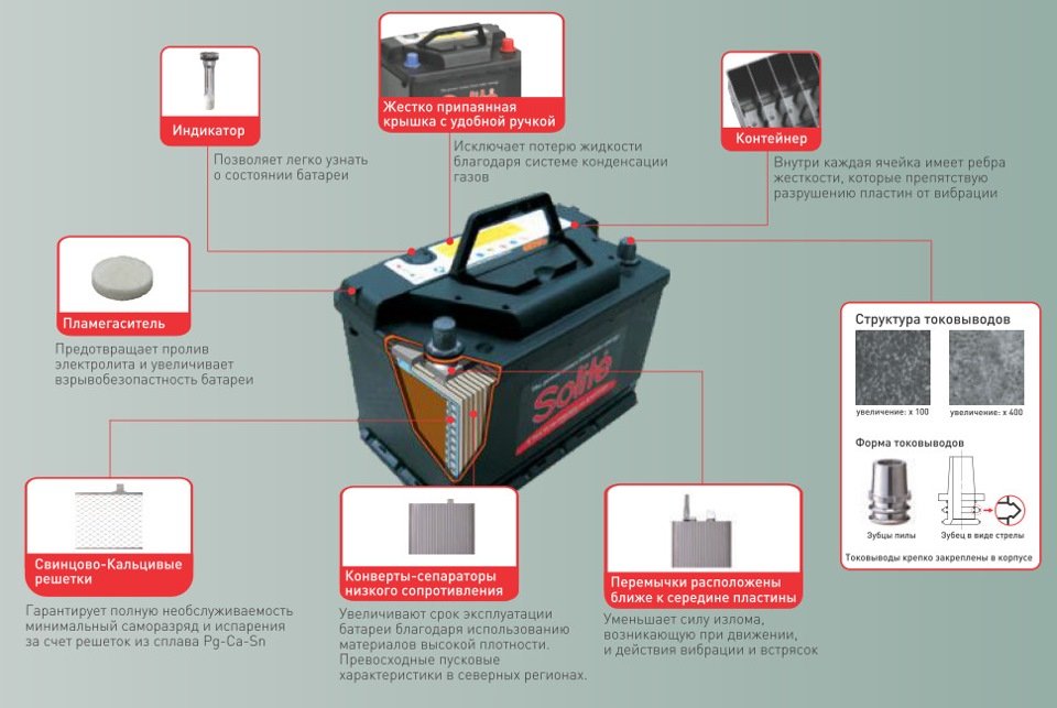 Fontos! A szolite elemek teljesen karbantartást nem igényelnek. Nincs szó a fedél levételéről és a víz hozzáadásáról. A karbantartás hiányát a kalciumötvözet-technológia alkalmazásával érik el.