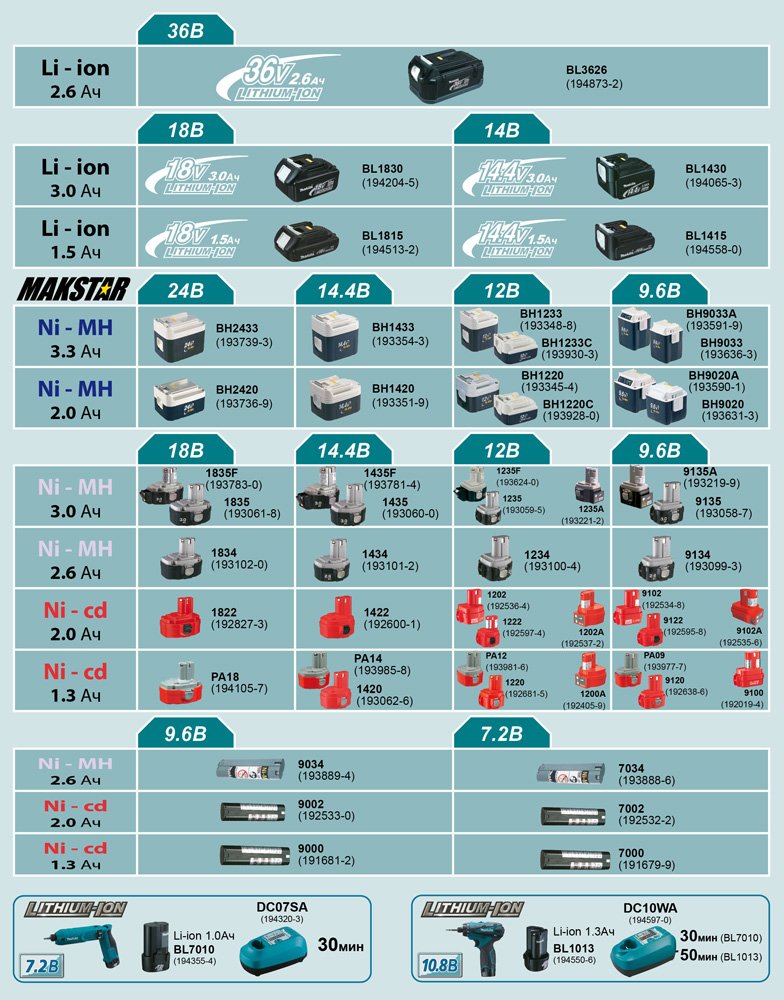 - 9,6 v. Gyakoribb módosítás, hogy a Makita akkumulátorok minden típusa létezik, kivéve a lítium-ion akkumulátorokat. Maximális kapacitás 3,3 Ah.