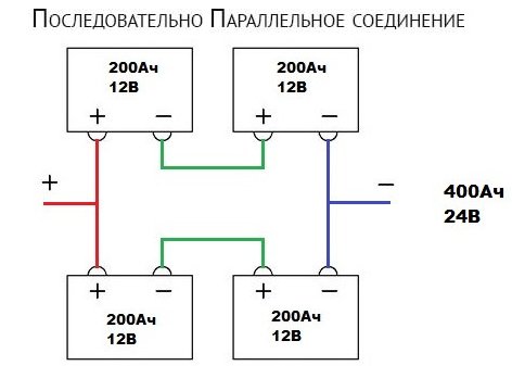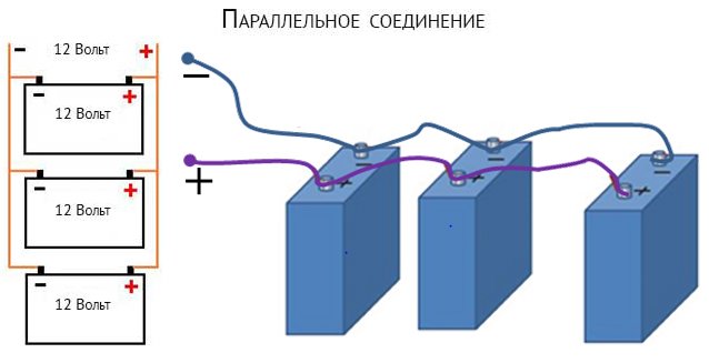 Ebben az esetben az összes anód egy közös vezetékkel van összekötve, a másiknál pedig az összes csatlakoztatott elem katódja. Ezt az áramkört akkor használják, ha a gyűjtő akkumulátor megnövelt áramerősségére van szükség.