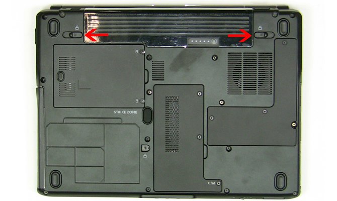 HP Bateri komputer riba HP dialih keluar dengan serentak mengalih kait, yang tidak sukar untuk dikesan jika anda menghidupkan peranti.