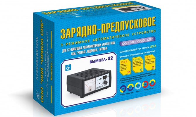 Enheten for å lade batterier Orion Vympel 32 har praktisk talt ingen begrensninger for arbeid med batterier. Enheten gjør en utmerket jobb med å gjenopprette ladningen til både små bilbatterier og kraftige batterier, som brukes til å gi lastebiler og spesialutstyr med likestrøm.