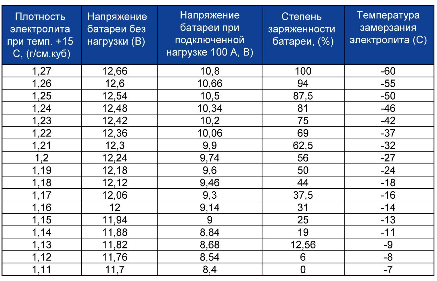 Przestrzegaj tego wskaźnika, jeśli maszyna pracuje w chłodne dni. Latem może zasilać akumulatory o gęstości 1,26 g / cm3 i większej. Jeśli gęstość elektrolitu mieści się w tych granicach, napięcie na zaciskach wyniesie około 12,7 V. Gdy gęstość spadnie, nastąpi proporcjonalne zmniejszenie różnicy potencjałów na zaciskach akumulatora.