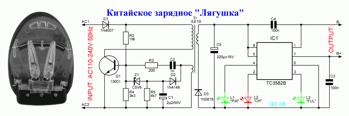 Schemat klasycznej żaby jest dość prosty. Dwa ruchome styki podłączone do akumulatora pochodzą ze sterownika. Rolę kontrolera pełnią mikroukłady o określonej złożoności. W szczególności zadaniem kontrolera jest porównanie napięcia na akumulatorze z wewnętrznym napięciem odniesienia. Gdy te dwa wskaźniki staną się identyczne, kontroler wyłączy zasilanie.