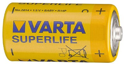 C-R14. Bateriile saline de unică folosință sunt cel mai ieftin tip primar de sursă curentă. R14 la 1,5 volți. Conform standardului ANSI, acestea sunt desemnate 14D. Sunt ușori în greutate și au performanțe reduse. Pot fi utilizate numai la dispozitivele cu un consum mic de curent (până la 200-400 mA) la temperaturi apropiate de temperatura camerei. La temperaturi sub zero, își pierd performanța.
