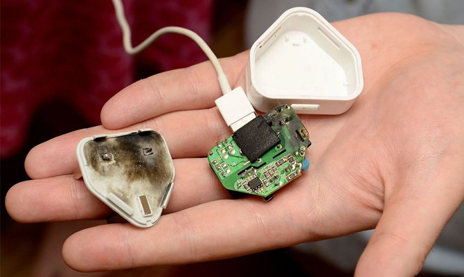Avec la destruction complète du boîtier du chargeur, il existe également un risque de choc électrique pour les personnes. Si le câble qui se connecte aux gadgets n'est pas trop élevé, les 220 volts standard sont à l'intérieur de la charge.
