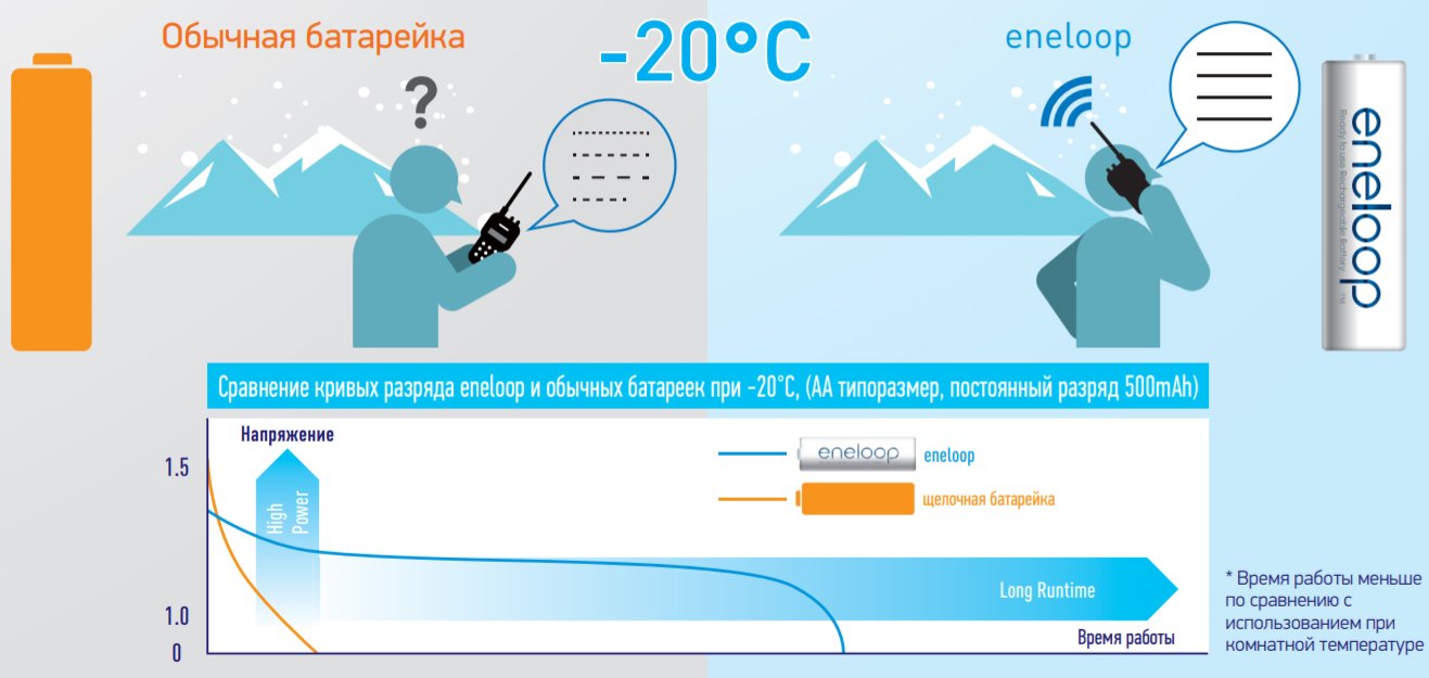 สำหรับแบตเตอรี่นี่เป็นตัวบ่งชี้ที่สำคัญมากเนื่องจากอุปกรณ์อิเล็กทรอนิกส์จำนวนมากปิดและปฏิเสธที่จะทำงานหากแรงดันไฟฟ้าภายนอกลดลงต่ำกว่า 1.2 V นอกจากนี้ตามที่ผู้ผลิตระบุว่าแบตเตอรี่ชนิดนี้ไม่ปล่อยที่อุณหภูมิต่ำและสามารถใช้งานได้ถึง -20 องศา .